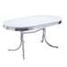 Bring vintage charm into your dining space with this retro-style oval dining table. Featuring a smooth white top with a chrome-rimmed edge, it channels classic mid-century diner vibes. The curvaceous chrome metal legs add stylish stability, while the easy-to-clean surface ensures practical everyday use. Perfect for creating a nostalgic, fun atmosphere in kitchens or casual dining areas.